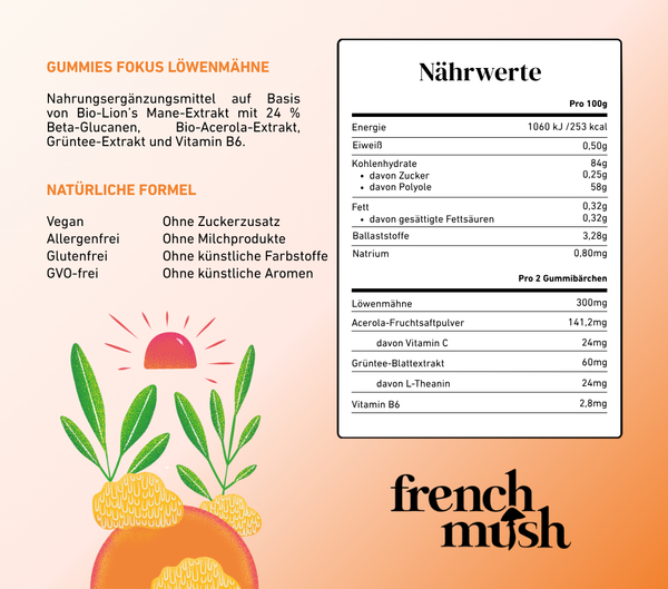 - Die Gummibärchen liefern 300 mg biologischen Lion’s Mane-Extrakt pro Portion, angereichert mit anderen natürlichen Wirkstoffen für eine vollständige und synergetische Wirkung.