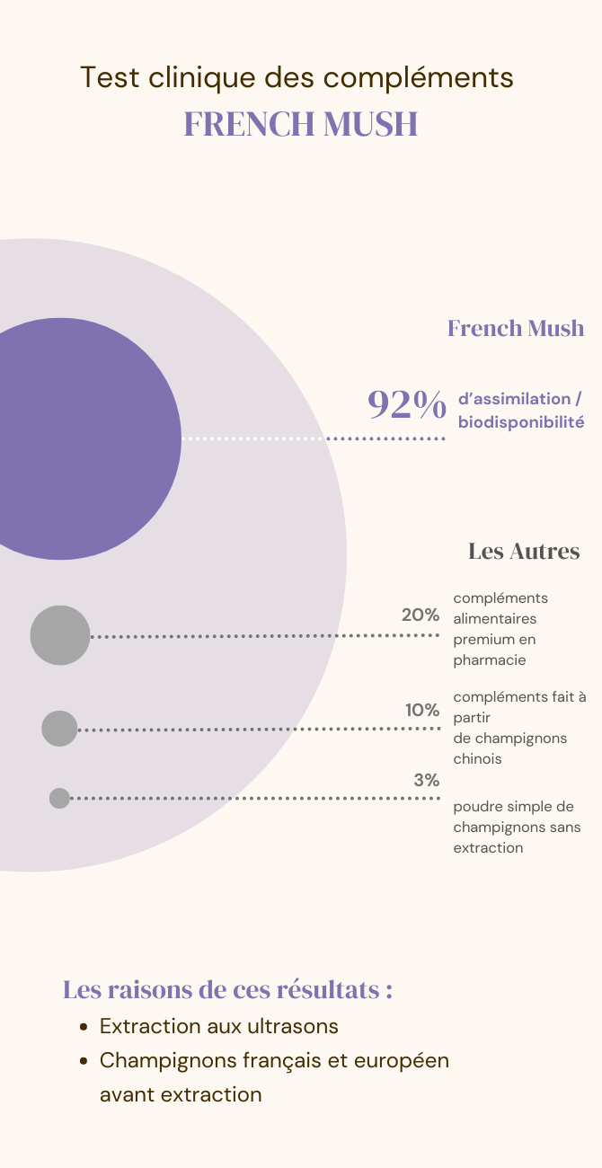 I principi attivi dei funghi (polisaccaridi, beta-glucani) non sono assimilabili dal corpo umano in forma grezza. Per renderli assimilabili, è necessario "rompere" queste molecole attraverso un'estrazione. French Mush privilegia l'estrazione dolce agli ultrasuoni. Dopo l'estrazione, i principi attivi sono altamente assimilabili e concentrati.A titolo di esempio, per un barattolo di 30 grammi di polvere + estratto French Mush, sono necessari in media 4 kg di funghi freschi e 400 grammi di funghi essiccati.