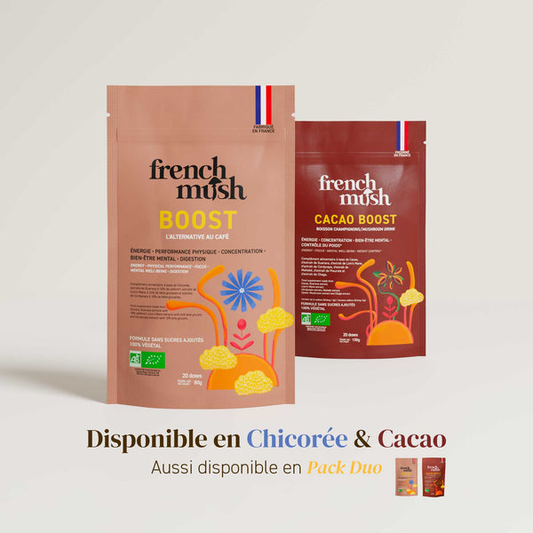 French Mush vous présente BOOST, une boisson formulée à partir d'ingrédients d'origine naturelle, conçue pour vous offrir une stimulation douce et durable sans les effets indésirables du café. Cette poudre soluble associe les bienfaits de la chicorée, du guarana et des Champignons adaptogènes français et fonctionnels que sont le cordyceps et le lion's mane.