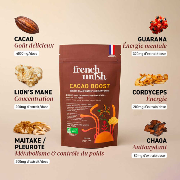 On a tous le même réflexe avec le café. Dès le matin, on cherche un coup de fouet pour démarrer la journée en pleine forme. Mais on finit souvent avec cette sensation de "crash" avant même d'avoir atteint l'heure du déjeuner. Pour y remédier, nous vous proposons chez French Mush le Cacao Boost. Il s’agit de notre tout nouveau produit : une boisson qui a un effet “boost” bio, et, qui mise sur une approche plus adaptée à votre corps. Plutôt que de brusquer votre organisme avec un shoot d'excitation, cette boisson à base de cacao et d’extraits de champignons biologiques mise sur une énergie stable tout au long de la journée.