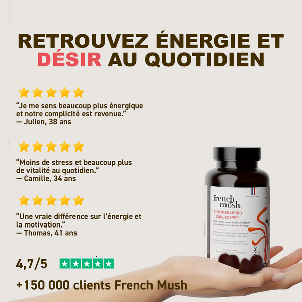 L’ensemble forme une formule exclusive développée par French Mush pour agir en synergie, en soutenant à la fois l’énergie physique, le bien-être émotionnel et la vitalité sexuelle chez l’homme comme chez la femme.